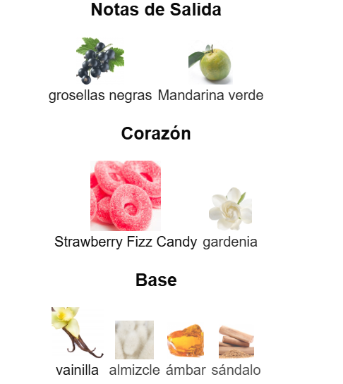 Las Notas de Salida son grosellas negras y Mandarina verde; las Notas de Corazón son Strawberry Fizz Candy y gardenia; las Notas de Fondo son vainilla, almizcle, ámbar y sándalo.